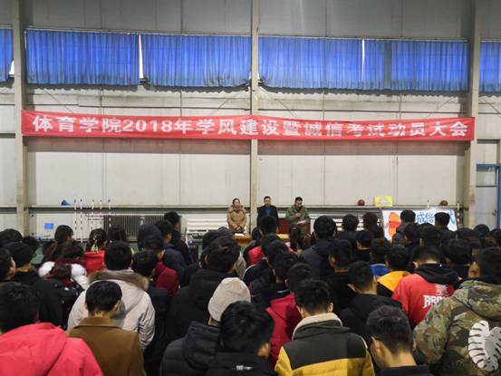 为促使2018—2019学年第一学期期末考试工作顺利进行,加强我院学风建设,提倡诚信考试,12月27日下午,我院在综合训练馆举行2018年学风建设暨诚信考试动员大会。参加本次大会有体育学院副院长高泳,团委书记郭全法,团委副书记陈芳芳以及学院400余名学生。