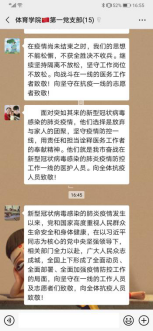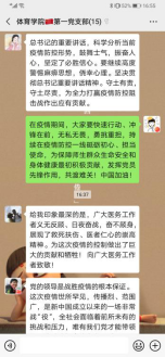 2月27日下午16:10,体育学院第一党支部在疫情期间,以微信会议的形式,召开学习习近平总书记在统筹推进新冠肺炎疫情防控和经济社会发展工作部署会议讲话的主题党日活动。