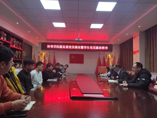 为加强对学生党员的教育管理,帮助新发展学生党员进一步树立党员意识,保证党员发展质量,提高学生党员廉洁自律意识。体育学院于12月14日晚上在会议室开展新发展党员谈话暨学生党员廉政教育。谈话由院党委书记徐现峰主持,党委副书记李志峰,学生党支部书记李听、龚婷,本学期新发展的18名预备党员参加会议。徐书记并为大家作题为《创“体正风清”体院,做“廉洁自律”党员》的党史学习教育主题党课。
