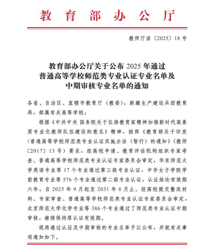 近日,教育部办公厅公布2025年通过普通高等学校师范类专业认证专业名单及中期审核专业名单,我院体育教育专业通过教育部师范类专业第二级认证。