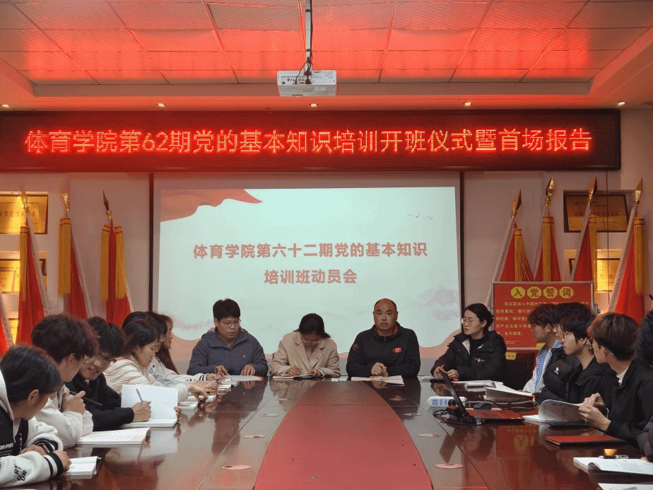 3月23日,体育学院第62期党的基本知识培训班正式开班,学院党委书记徐现峰、党委副书记梁瑞、全体辅导员及本期21名入党积极分子参会,开班仪式由学院团委书记张向丽主持。